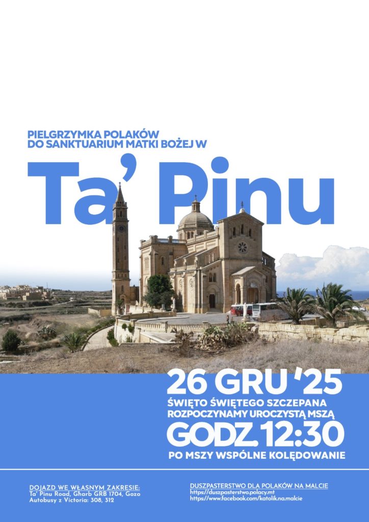 Zapraszamy wszystkich Polaków mieszkających na Malcie i Gozo na pielgrzymkę do Sanktuarium Matki Bożej w Ta’ Pinu, która odbędzie się 26 grudnia 2025 r., w Święto św. Szczepana.